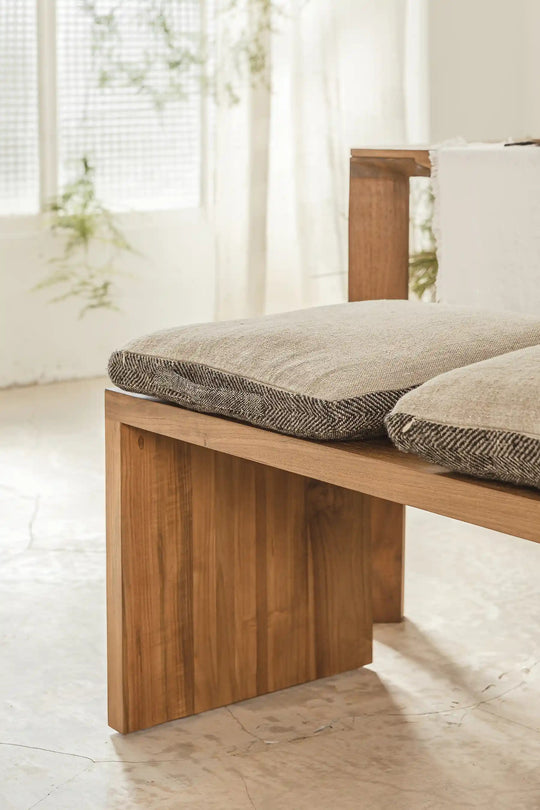 Le banc GENESIS de Dareels met en avant les caractéristiques distinctives de cette collection. Fabriqué entièrement en bois de teck recyclé, la structure qui forme l’assise et les pieds est composée de trois planches de largeur et d’épaisseur égales, assemblées avec précision grâce à un joint en queue d’aronde. Le résultat est un design solide, épuré et homogène, donnant l’impression d’une pièce unique.